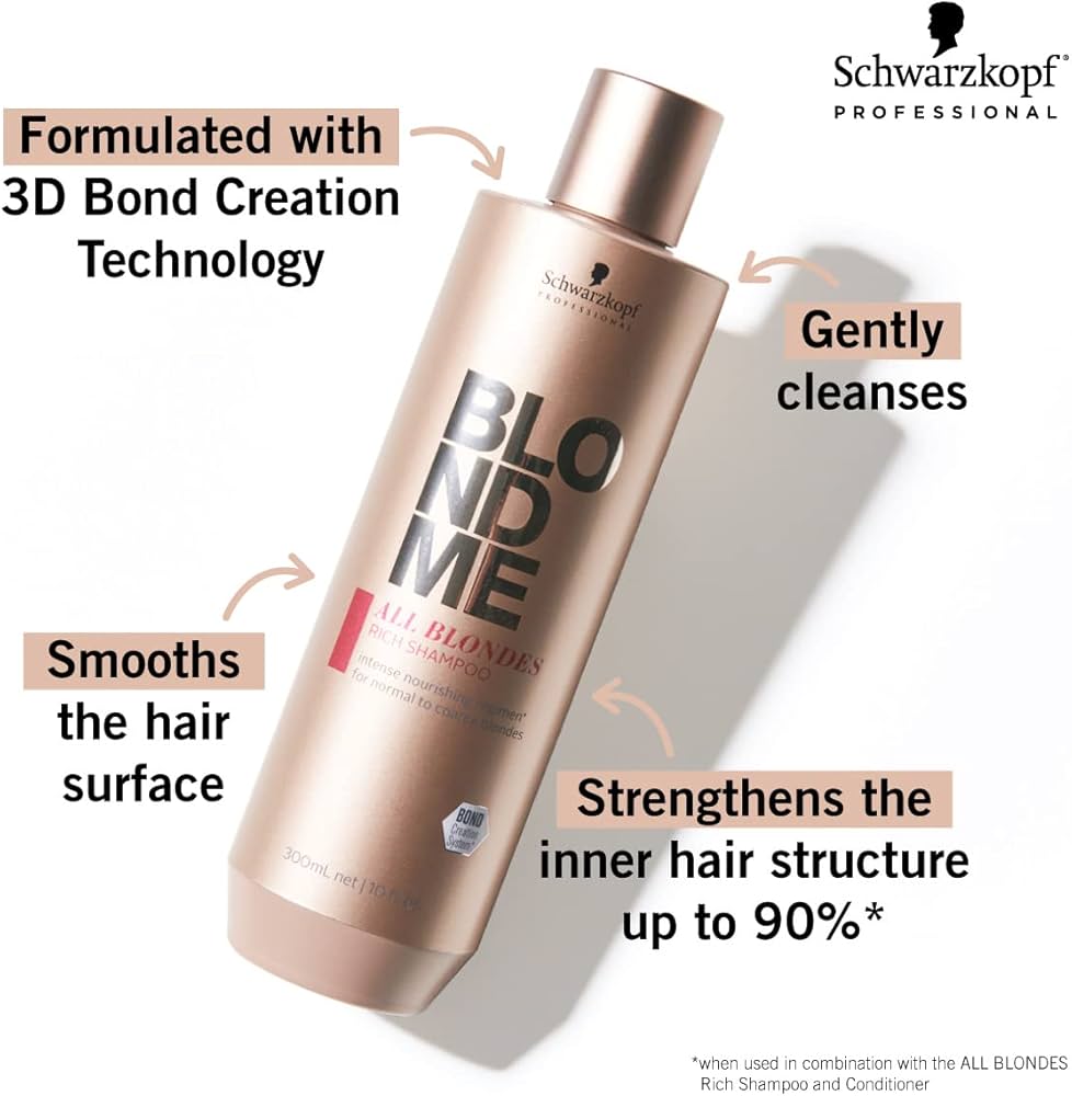 The Schwarzkopf BlondMe All Blondes Rich Shampoo (300mL) is a sulfate-free shampoo designed to gently cleanse and nourish medium to coarse blonde hair types. It features the 3D Bond Creation Technology, which works deep within the hair fiber to rebuild and restore inner bonds, enhancing hair strength and resilience. Additionally, it contains Cashmere Extract, known for its moisture-binding properties, helping to smooth the hair surface and prevent breakage and split ends.